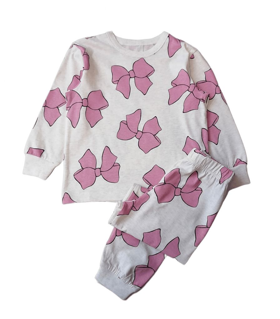 Пижамата е с дълъг ръкав и дълго долнище, в светлобежов цвят и фигурки на панделки в тъмнорозово.