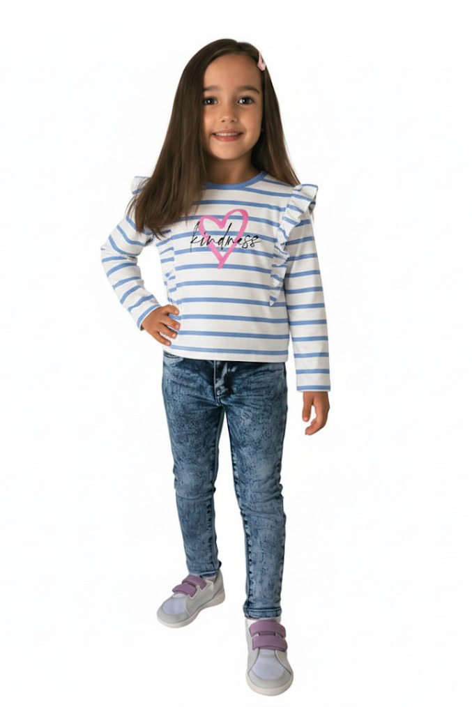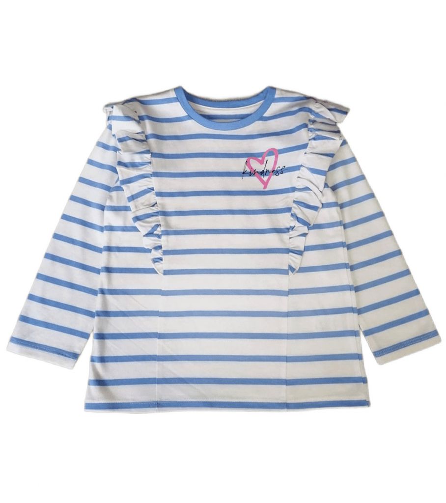 GMAT1268Блузата е бяла, с тънко светлосиньо райе и къдрици в областта на раменете и предницата. Оляво има малко розово сърце и надпис "Kindness".Марка: MatalanСъстав: 100% памук