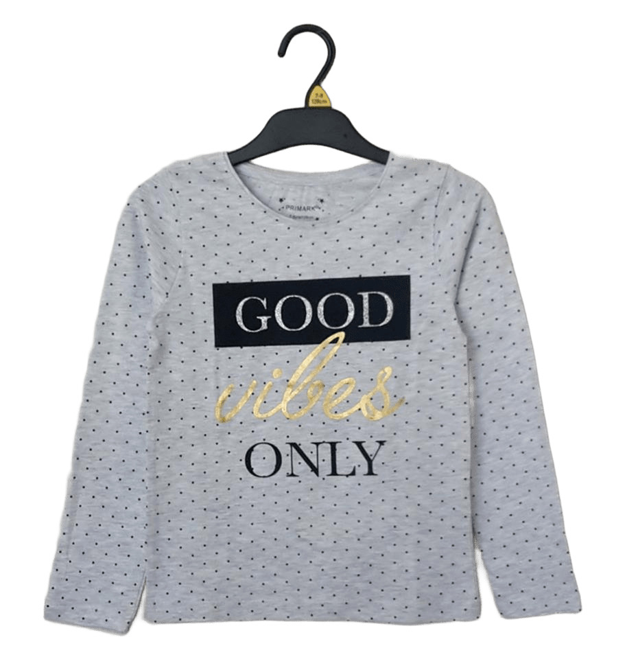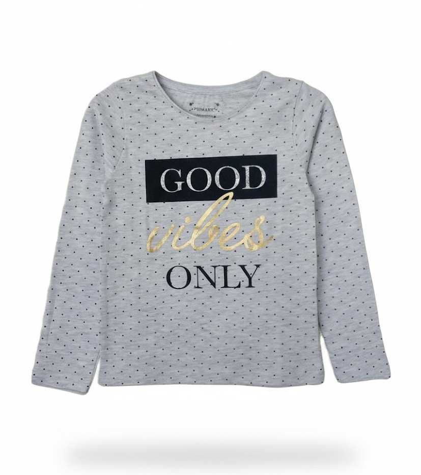 GPM1136Блуза с дълъг ръкав в светлосив меланж и дребни черни точици. Отпред има надпис GOOD VIBES ONLY, апликиран със сребърен и златен брокат.Марка: PrimarkСъстав: 98% памук, 2% полиестер