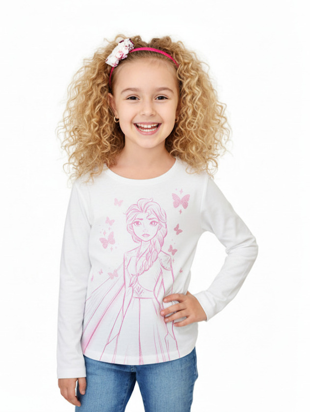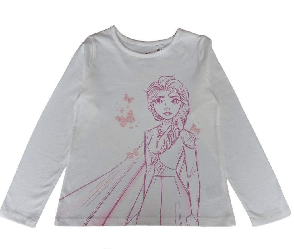 GHM1333-1Блузата е с дълъг ръкав, в бяло, с розова фигурка на Елза и пеперуди отпред.Марка: H&MСъстав: 100% памук