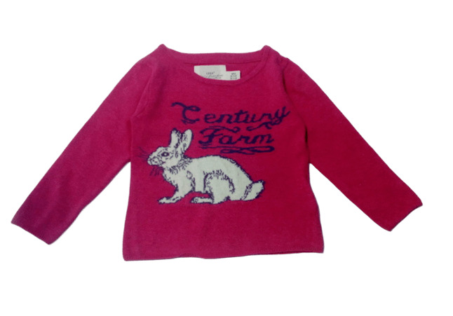 WHMF1092Пуловерът е тънко плетиво в цикламен цвят. Отпред има фигурка на бяло зайче и лилав надпис "Century Farm".Марка: H&MСъстав: 40% памук, 30% полиамид, 25% вискоза, 5% ангора