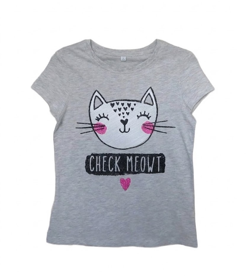 GGE1758Тениската е в светлосив цвят, с изображение на коте с розови бузки, черна лента с надпис "CHECK MEOWT" и цикламено сърце. Всички цветове са подсилени с брокат.Марка: GeorgeСъстав: 98% памук, 2% вискоза