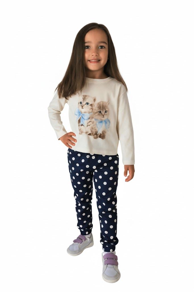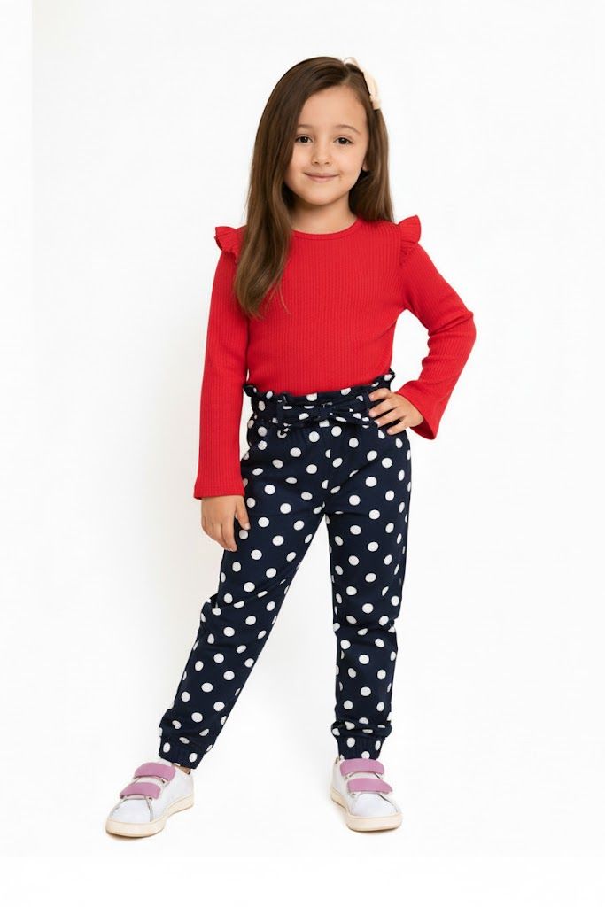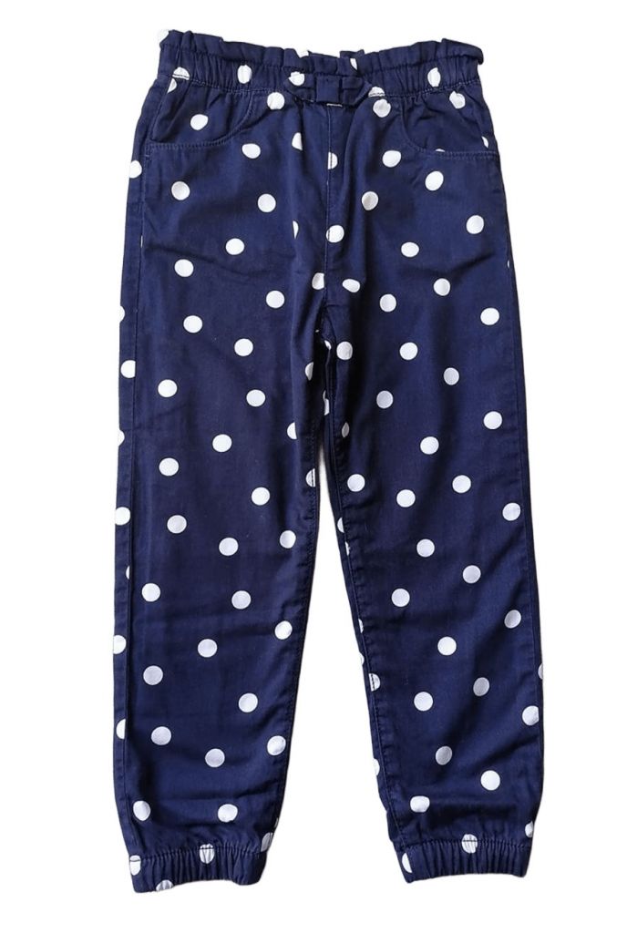 Панталонът е от тъмносин памучен плат на едри бели точки, с тънка трикотажна подплата отвътре. Има ластична талия, два джоба и малка декоративна панделка на колана отпред. Подходящ за хладните месеци.