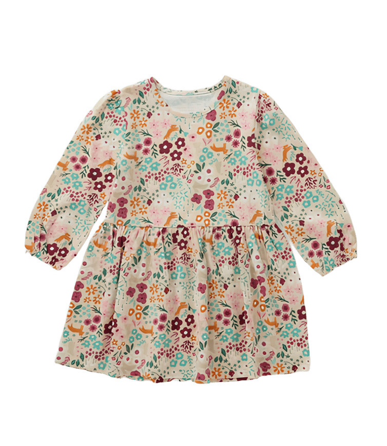Роклята е с дълъг ръкав, в бежов цвят на пъстри цветчета в бордо, жълто, розово и зелено и дребни фигурки на зайчета и лисици. Долната част е трапецовидно разкроена, с набор в областта на талията.