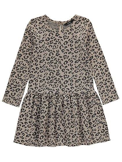 VGE249Роклята е от много тънко плетиво в светлокафяв цвят, с тъмнокафява леопардова шарка. Има права кройка и широк волан в долната част. Закопчава се с едно копче на гърба.Марка: GeorgeСъстав: 65% акрил, 35% полиестер