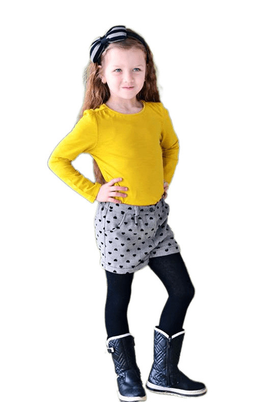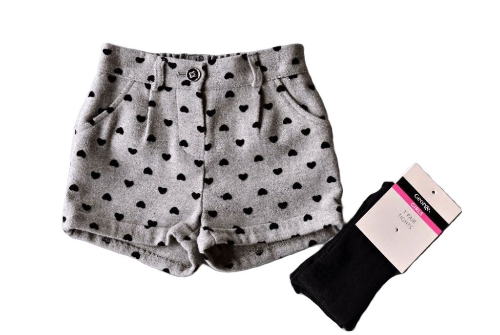 Комплектът се състои от къси панталонки и чорапогащник. Панталонките са от плътна материя в сиво, с черни сърчица. Имат два джоба отпред, два декоративни джоба отзад под формата на панделки и ластик в задната част на колана. Чорапогащникът е черен, без релеф.