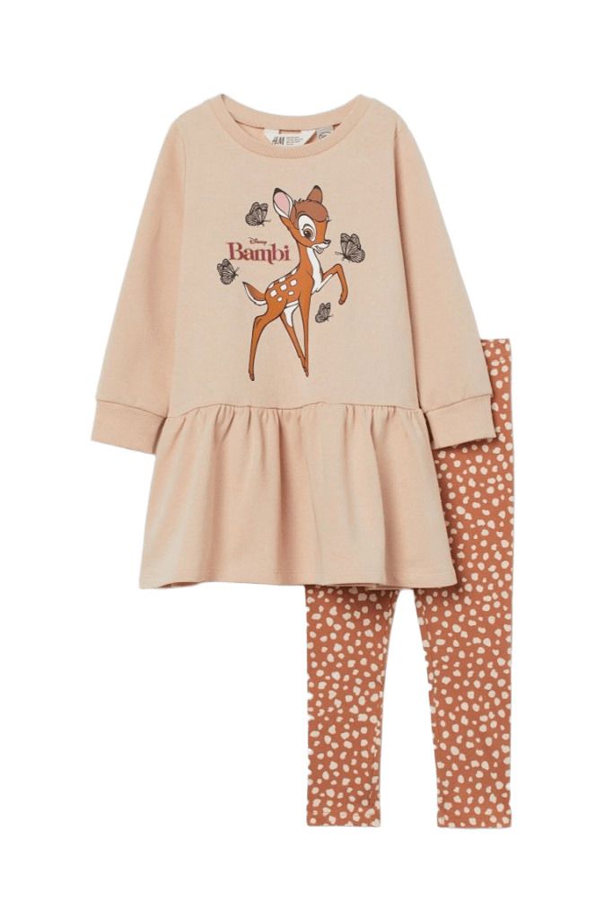 Комплектът се състои от рокля и клин. Роклята е леко ватирана, в светъл бежов цвят, с широк набран волан отдолу и изображение на сърничката Бамби отпред. Клинчето е кафяво с бели точки.