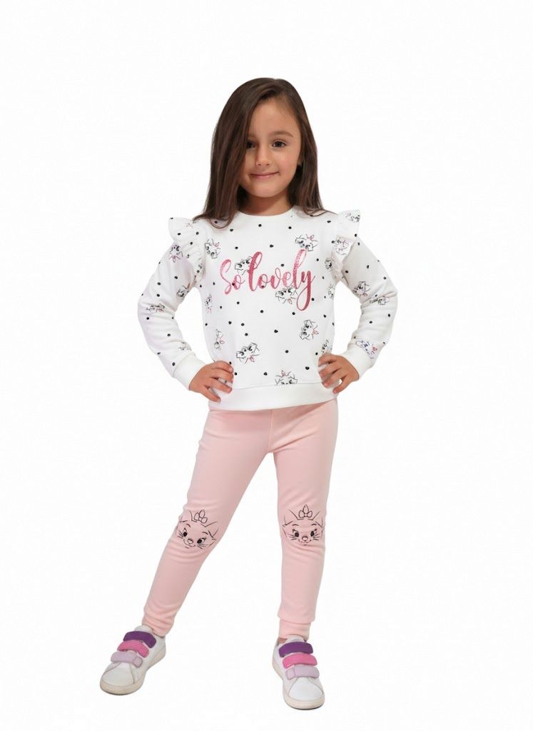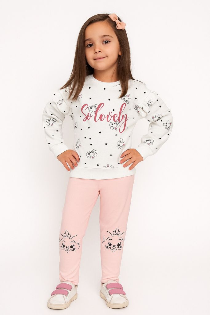 Комплектът се състои от блуза и клин. Блузата е бяла, леко ватирана, с къдрици на раменете. Има дребни фигурки на котенца, черни сърчица и точки и надпис "So lovely" с розов брокат. Клинчето е бледорозово, с черни котенца на крачолите отпред.