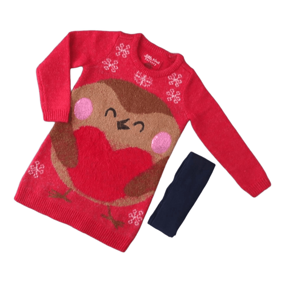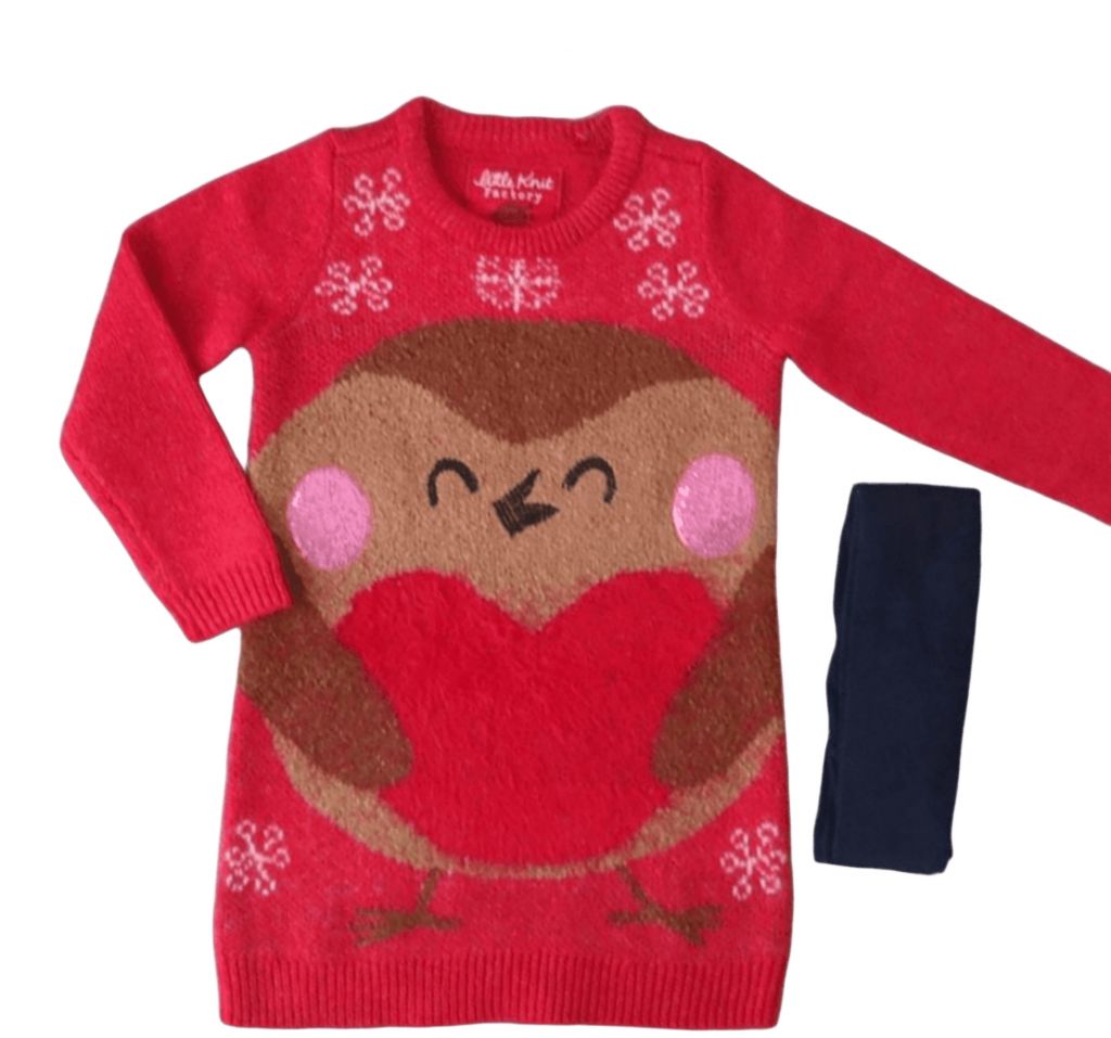 Комплектът се състои от рокля и чорапогащник. Роклята е от плътно плетиво в червен цвят, с изображение на снежинки и кафяво птиче, което държи сърце. Човката, очите и бузите са декорирани с пайети. Чорапогащникът е тъмносин.