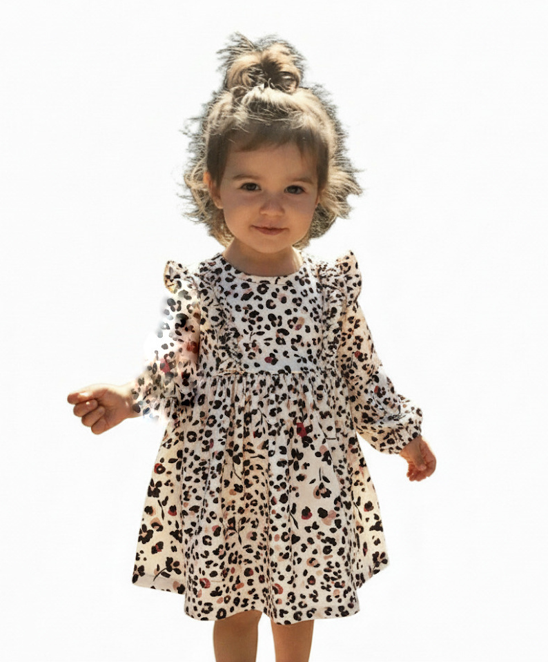 GMAT1248Роклята е с дълъг ръкав, в цвят слонова кост и дребни цветчета в черно, охра и бордо. На предницата има два реда вертикални къдрици, а поличката е свободна, с широк набор в талията.Марка: MatalanСъстав: 100% памук
