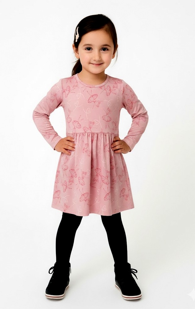 Роклята е с дълъг ръкав, в цвят пепел от рози и фигурки на тъмнорозови балерини. Долната част е трапецовидно разкроена, с набор в областта на талията.