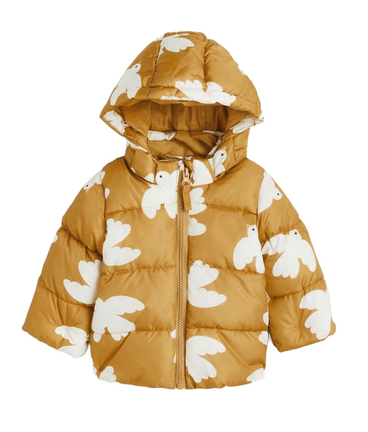 Якето е в цвят горчица, с големи фигурки на бели птички. Вътрешността е от пресована вата, а подплатата е от памучен плат. Качулката е подвижна и се поставя посредством велкро лепенки.