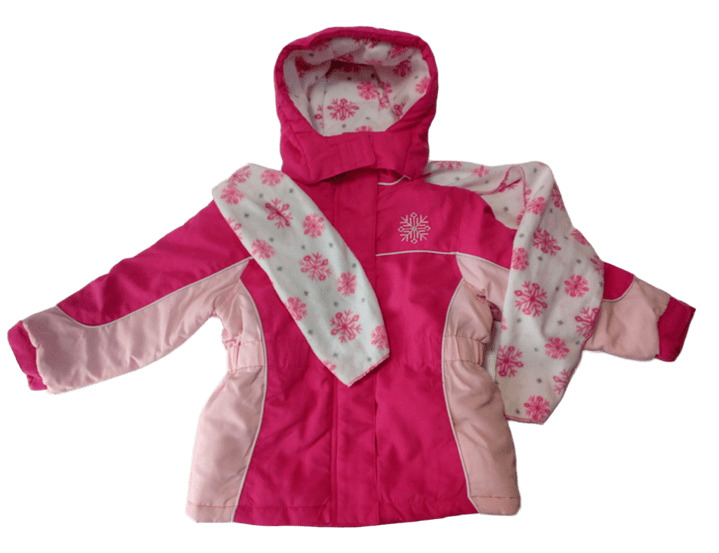 Якето е в тъмнорозов цвят, със светлорозови елементи по част от ръкава и страничните ръбове. Вътрешността е от пресована вата. Качулката и областта около врата са подплатени с полар в бяло и розови снежинки. От същия плат е и шалчето, което допълва комплекта. В предната лява част има бродерия на снежинка в сребрист цвят.