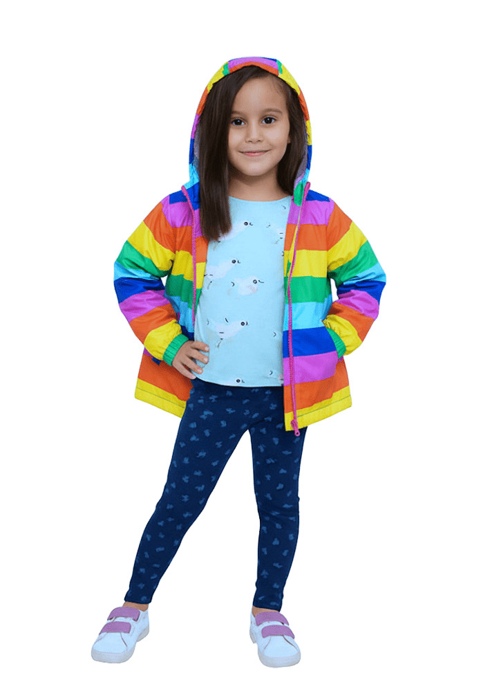 Тънко яке в на широко райе в цветовете на дъгата. Моделът е с качулка, памучна подплата и е изработен от материя с водоотблъскващо покритие за защита от лек дъжд.