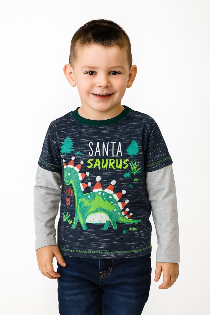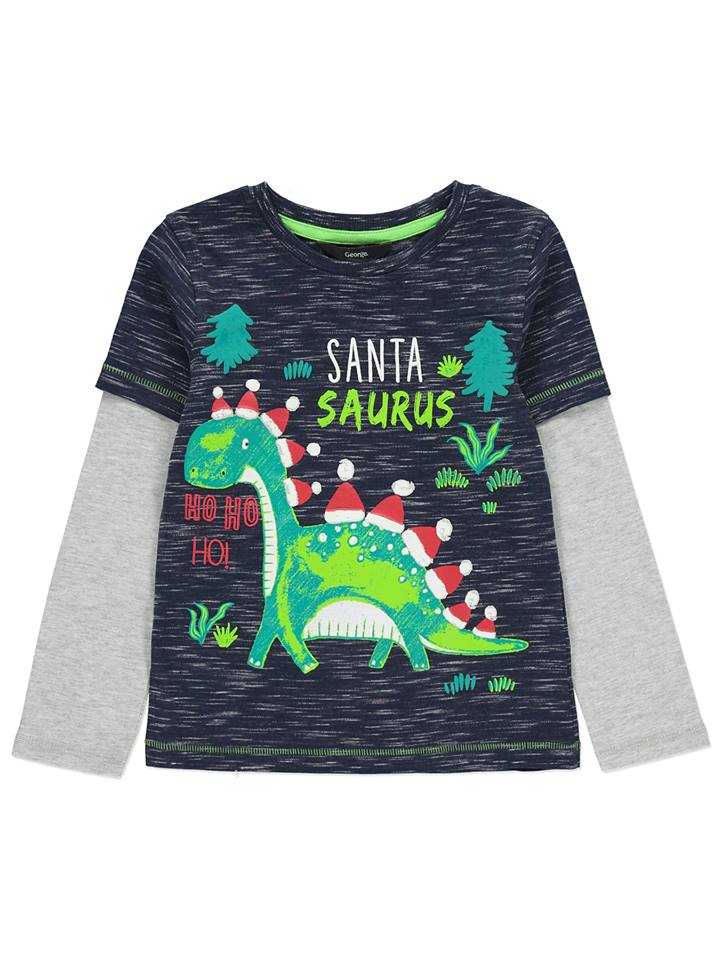 DGE427Блузката е от трико в тъмносин меланж, със сиви ръкави. Отпред има щампа на динозавър с коледни елементи и надписи "Ho ho ho" и "Santa saurus".Марка: GeorgeСъстав: 82% памук, 6% полиестер, 2% вискоза