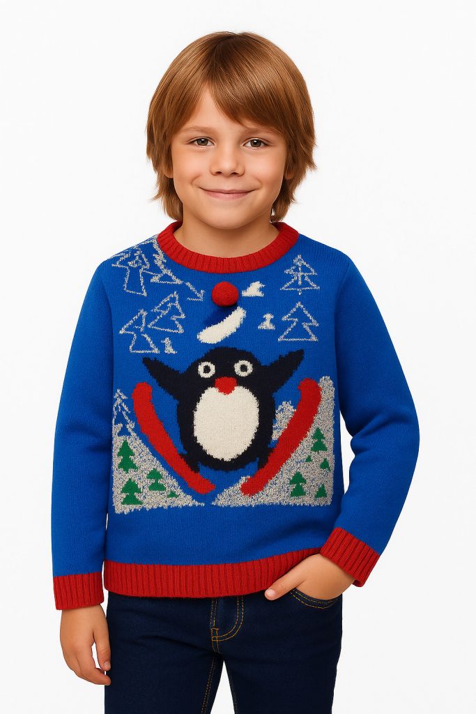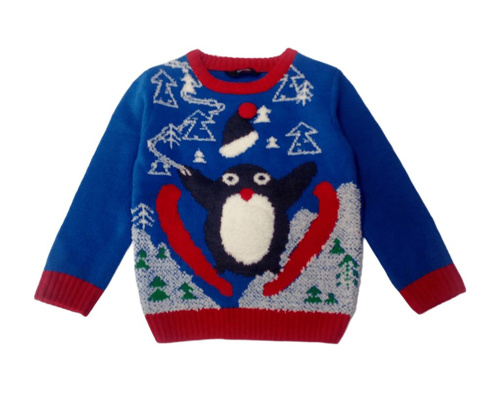 Пуловерът е в наситеносин цвят, с червен ластик отдолу, на ръкавите и около деколтето. Има фигурка на пингвинче с шапка и ски и елхички в бяло и зелено. В бялата част на коремчето има вграден бутон, който издава звук при натискане.