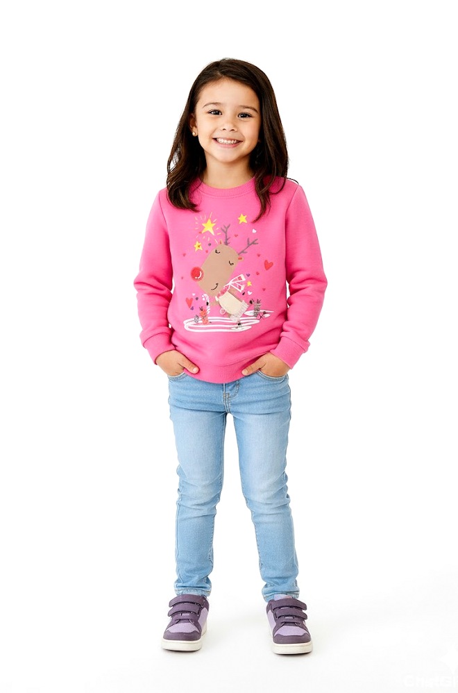 AGE416Блузата е ватирана, в наситенорозов цвят. В предната част има изображение на пързалящо се еленче, комбинация от щампа и апликация с плат.Марка: GeorgeСъстав: 100% памук