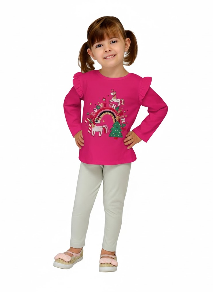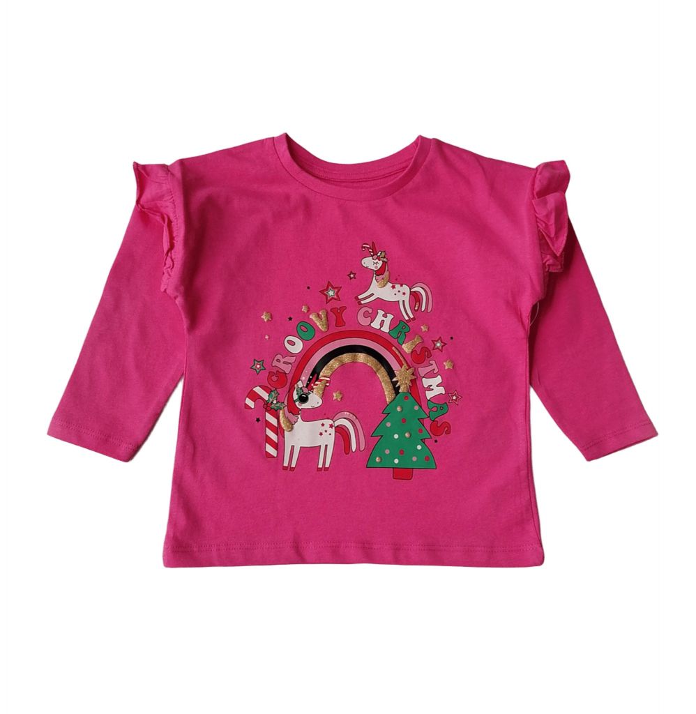 Блузката е в наситен розов цвят, с коледни мотиви отпред и къдрици в областта на раменете.