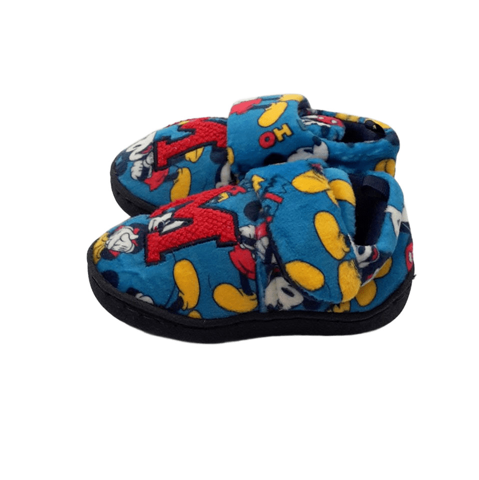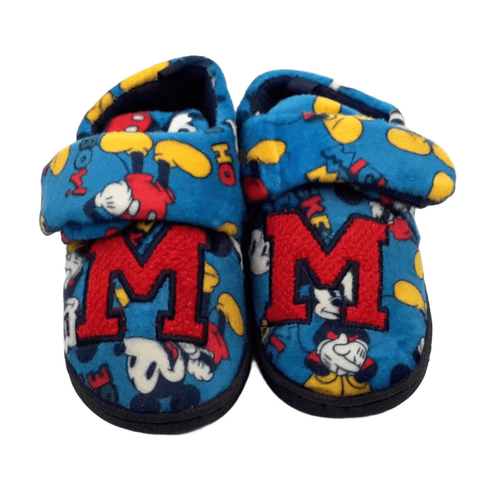 Топлинките са с гумена подметка в тъмносиньо. Вътрешността е от текстил, а стелката е омекотена. Външната част е синя, с дребни изображения на Мики Маус и голяма червена буква М отпред. Закопчаването е с велкро лепенка.