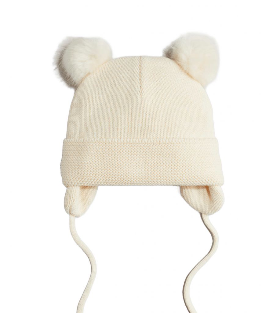 Плетена шапка тип ушанка в цвят слонова кост, с обърнат маншет и два пискюла. Наушниците завършват с шнурове. Подплатата е от бял полар.