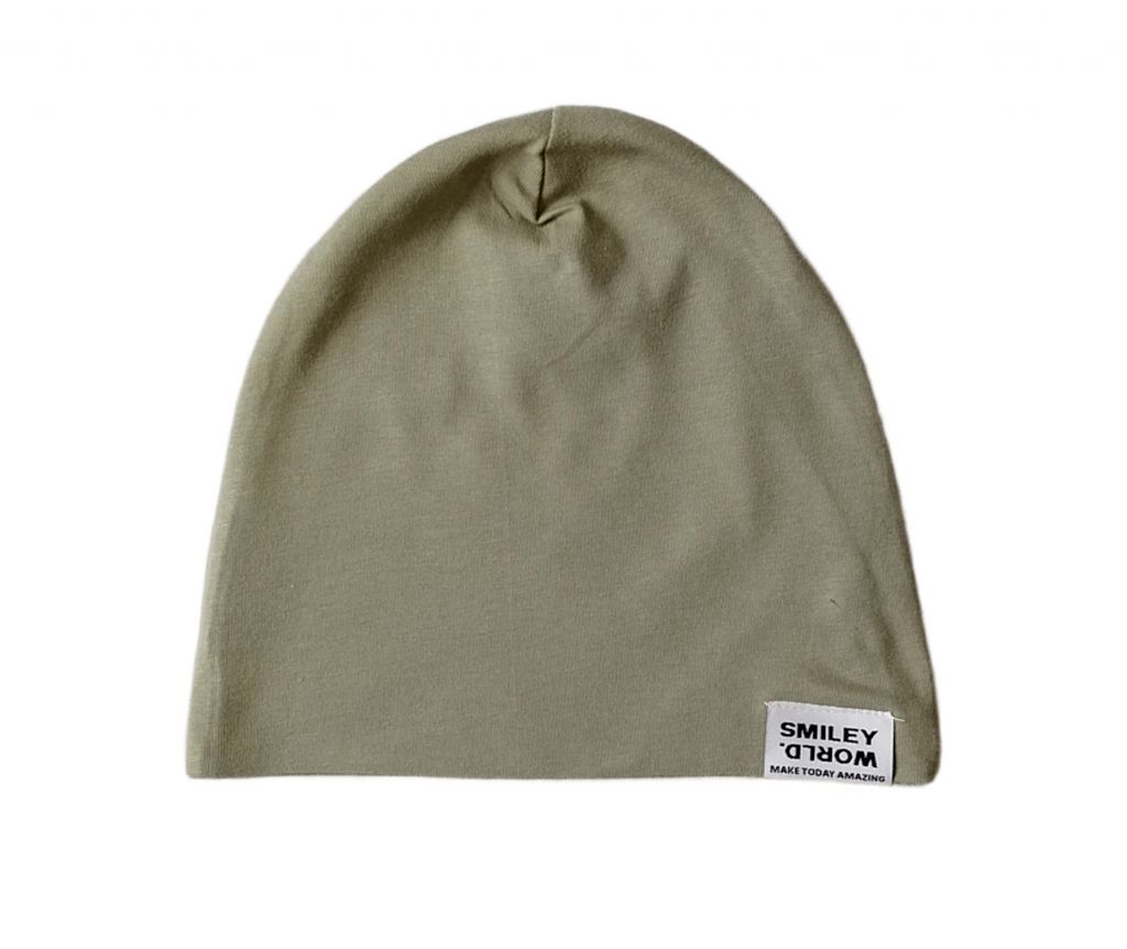 Тънка шапка от мек трикотажен плат в масленозелен цвят.