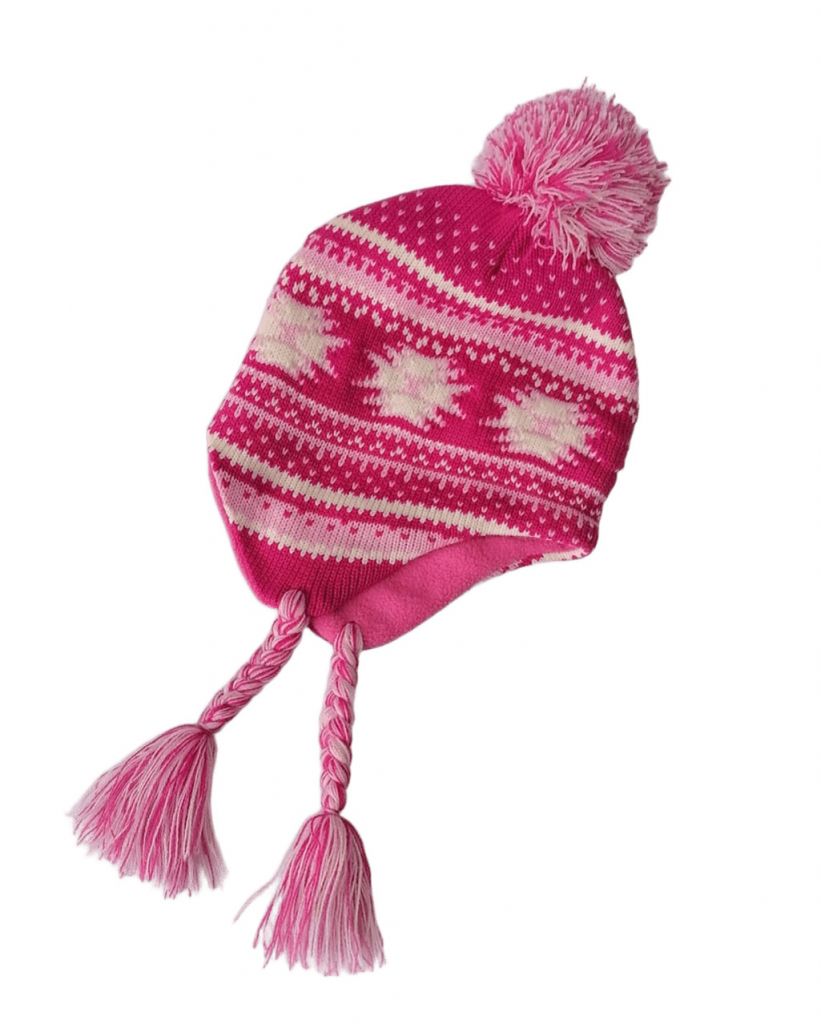 Плетена шапка тип ушанка в тъмнорозов цвят, с геометрични фигури в светлорозово и бяло. Наушниците имат плетени шнурове, които завършват с пискюли. Подплатата е от розов полар.